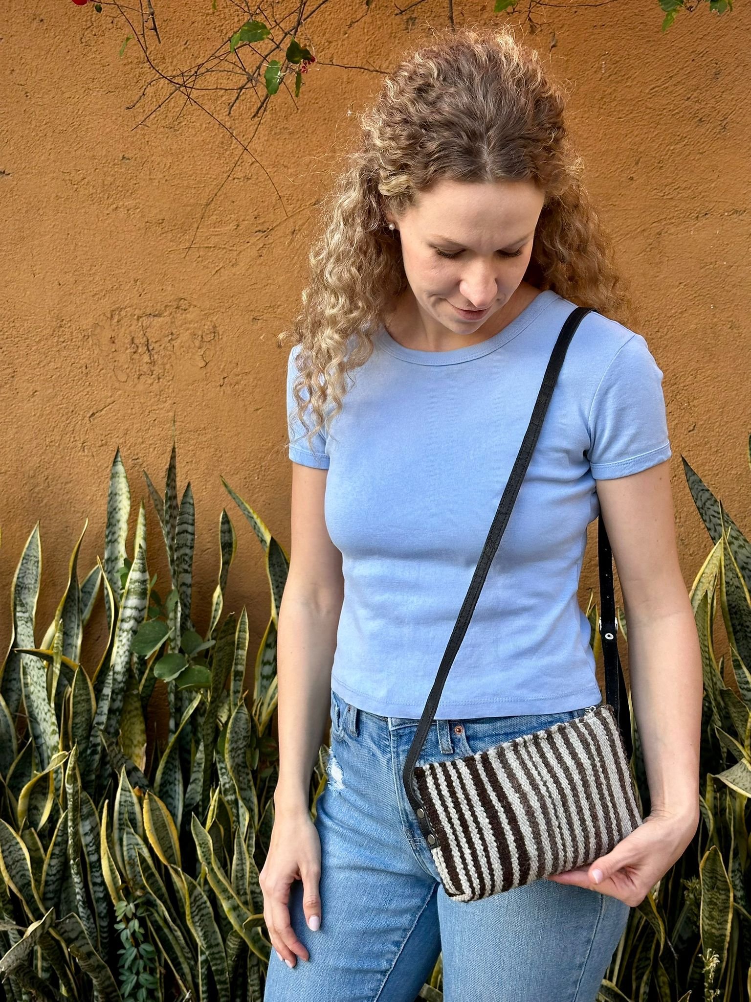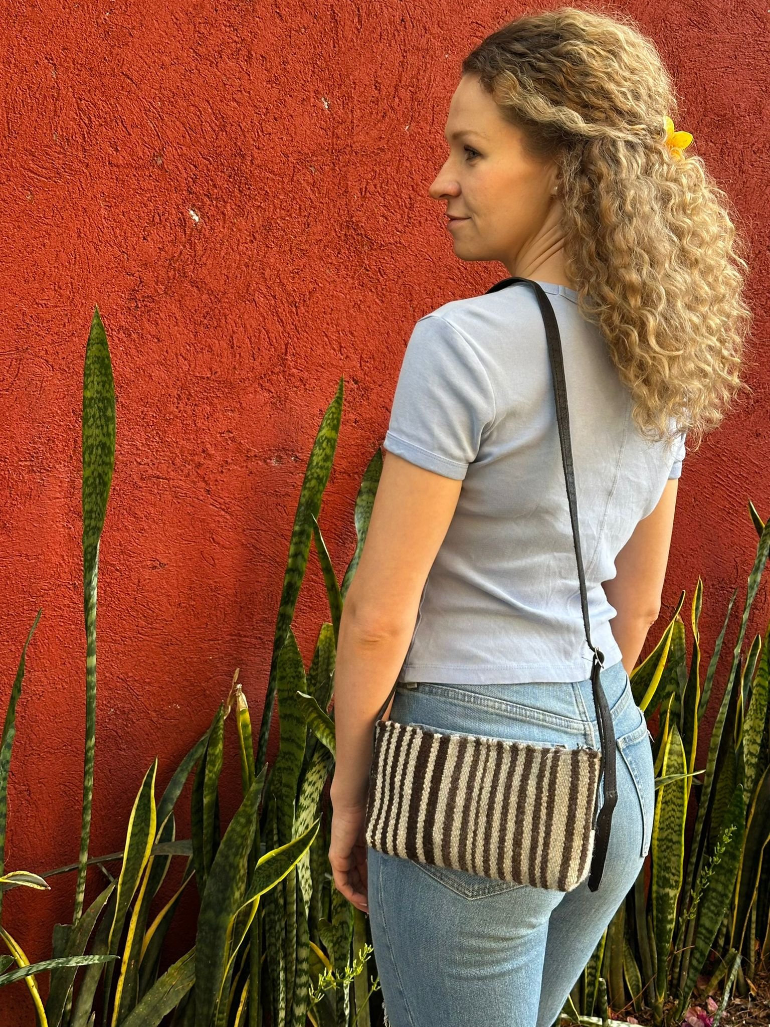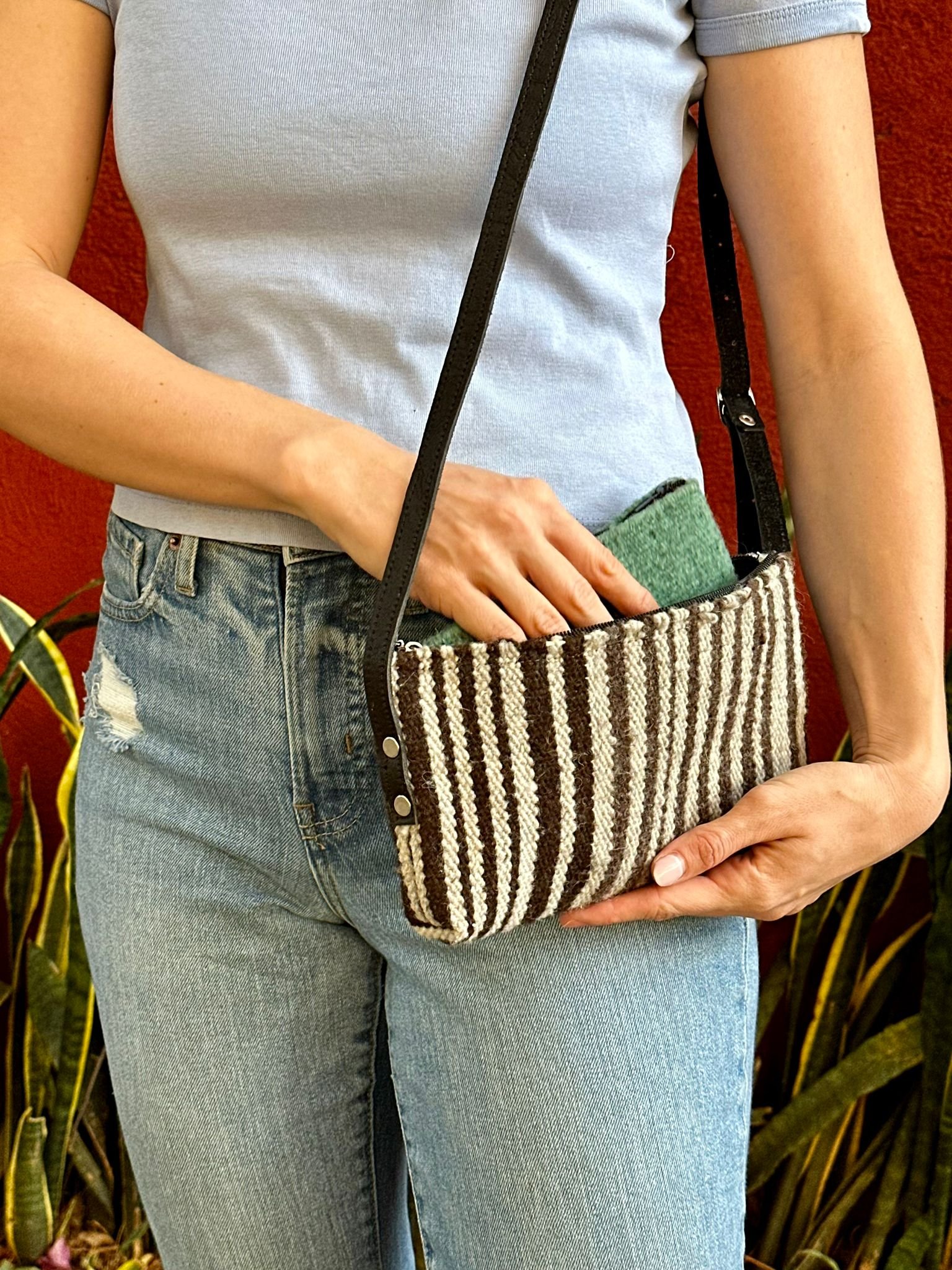 This wool bag is handmade by Valeriano. He weaves the wool fabric on a pedal loom, then adds an inner pocket made from manta (cotton fabric), a zipper, and leather straps. The bag is made to order and will be ready to ship next Friday after your order is placed.