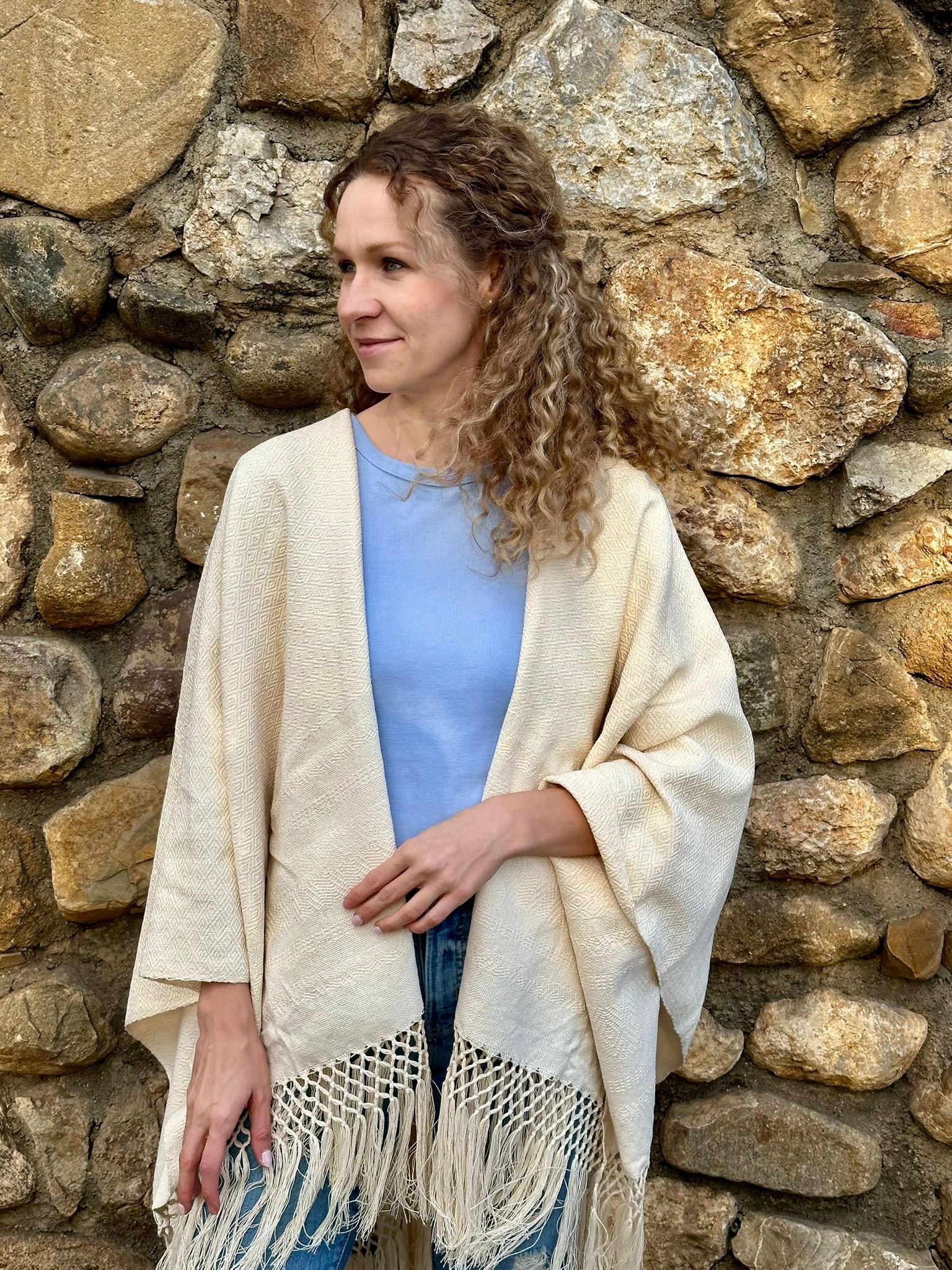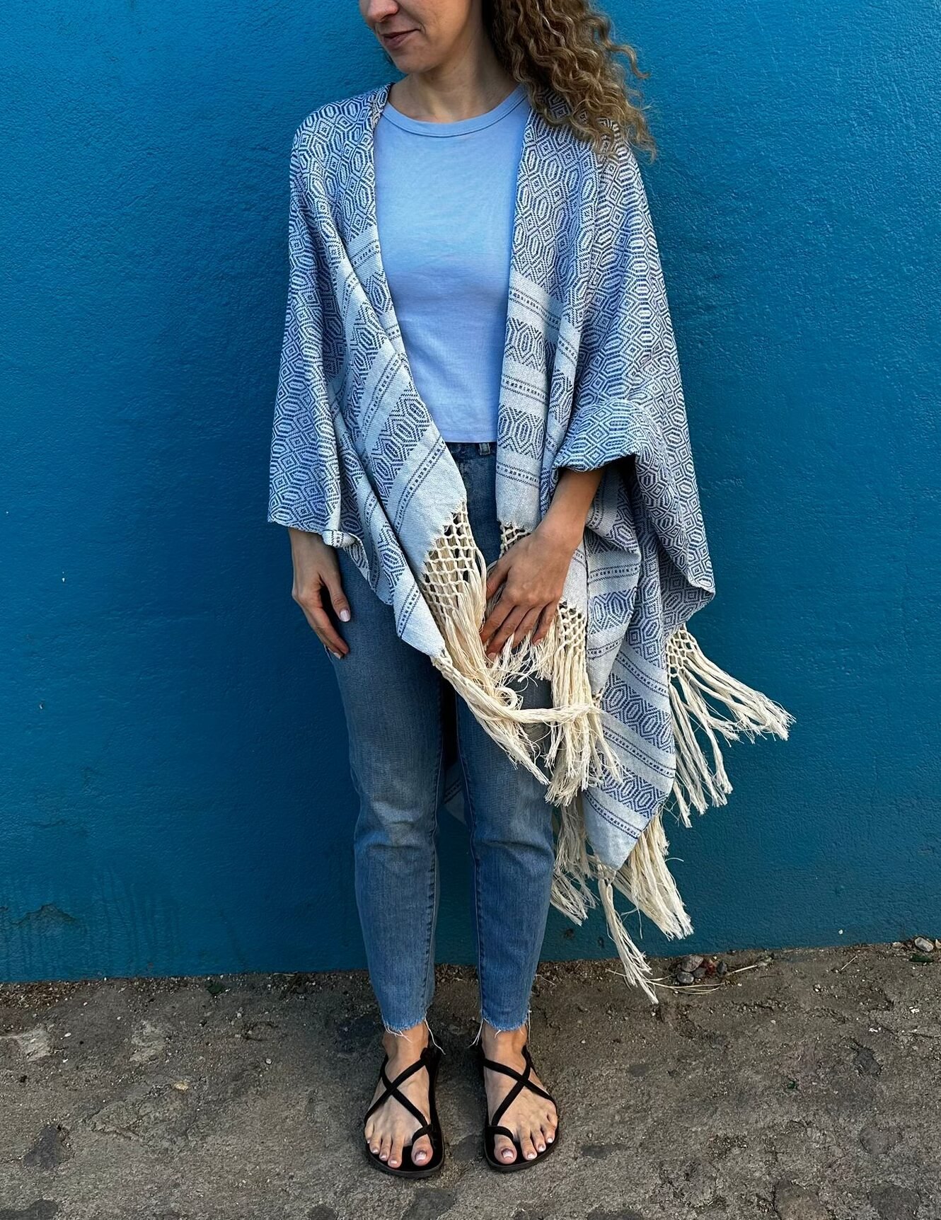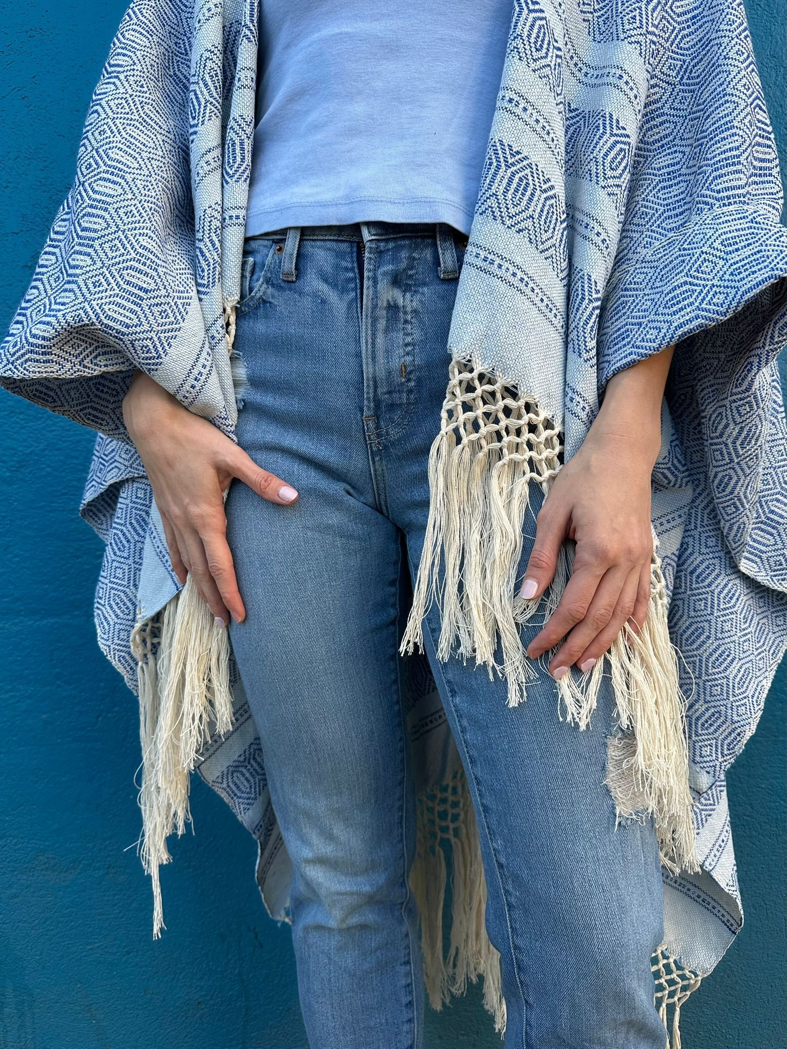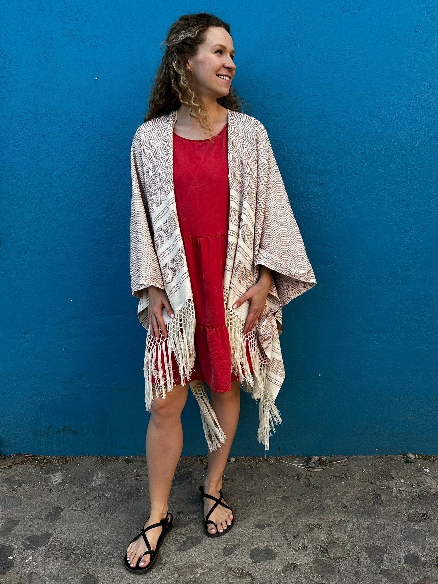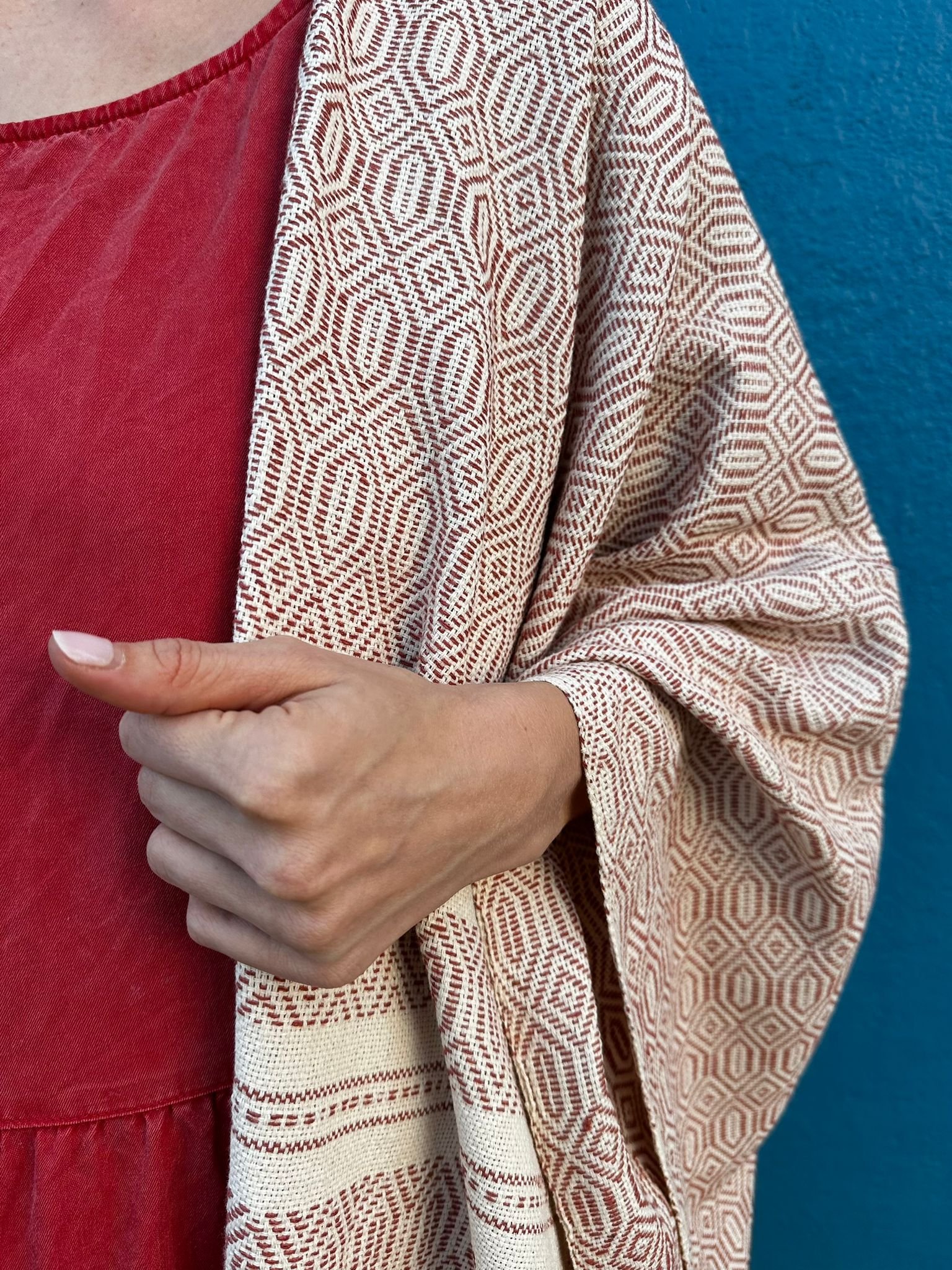 This cardigan is handmade from 100% cotton by Ana, the daughter of our rebozo artisan. It is crafted from scratch using rebozo fabric woven on a pedal loom and then sewn on a sewing machine. It is made to order and will be ready to ship next Friday after your order is placed.